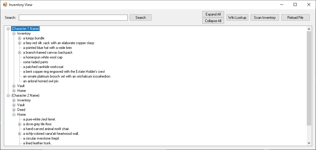 The Inventory View form contains a tree list of each character that you've done an inventory scan. Each character splits into the inventory, vault and home as applicable and shows your containers and items in a tree structure that can be expanded or collapsed.